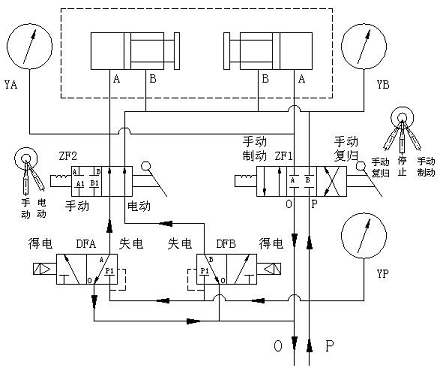 1、自動(dòng)回路:將手動(dòng)轉(zhuǎn)閥ZF1的手柄扳到停止位置,手動(dòng)轉(zhuǎn)閥ZF2的手柄扳到電動(dòng)位置,壓縮空氣進(jìn)入電磁換向閥DFA、DFB的壓力腔(進(jìn)氣腔),并密封在壓力腔內(nèi),左、右工作腔與排氣腔接通。