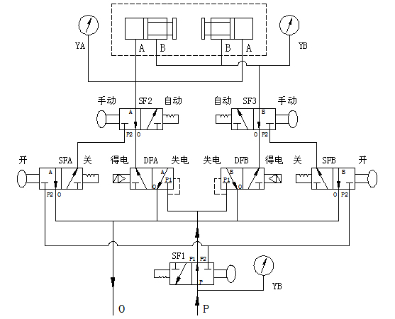 手動剎車:手拉閥SFA、SFB處于關(guān)的狀態(tài),手拉閥SF1、SF2、SF3往外拉至手動狀態(tài),當(dāng)滿足機(jī)組停機(jī)條件時,操作往外拉手拉閥SFA于開狀態(tài),使壓縮氣體進(jìn)入制動腔,當(dāng)轉(zhuǎn)速降為零時,過一分鐘后往里推手拉閥SFA于關(guān)狀態(tài),排出制動腔氣體;再往外拉手拉閥SFB于開狀態(tài),使壓縮氣體進(jìn)入復(fù)歸腔,制動器復(fù)位后往里推手拉閥SFB于關(guān)狀態(tài),使復(fù)歸腔氣壓排出。從而從而完成機(jī)組手動停機(jī)過程。